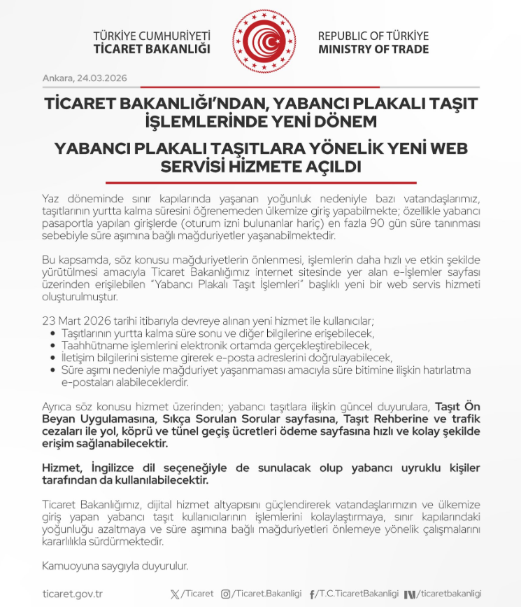 Bu kapsamda, söz konusu mağduriyetlerin önlenmesi, işlemlerin daha hızlı ve etkin şekilde yürütülmesi amacıyla Ticaret Bakanlığımız internet sitesinde yer alan e-İşlemler sayfası üzerinden erişilebilen “Yabancı Plakalı Taşıt İşlemleri” başlıklı yeni bir web servis hizmetine aşağıdaki bağlantıdan ulaşılması mümkündür.